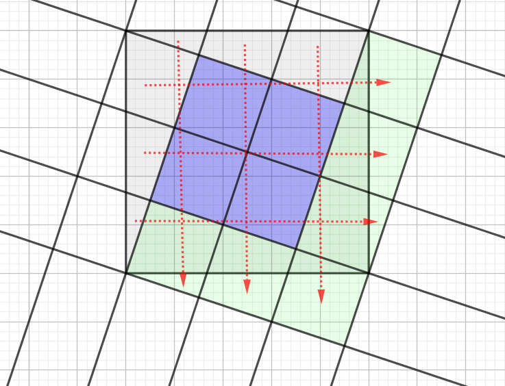 If I add in more parallel lines, splitting the shaded bit into four equal pieces, and jigsaw the outside pieces around to make congruent squares, I find there are six of those. So the blue area is two-fifths of the shaded area.