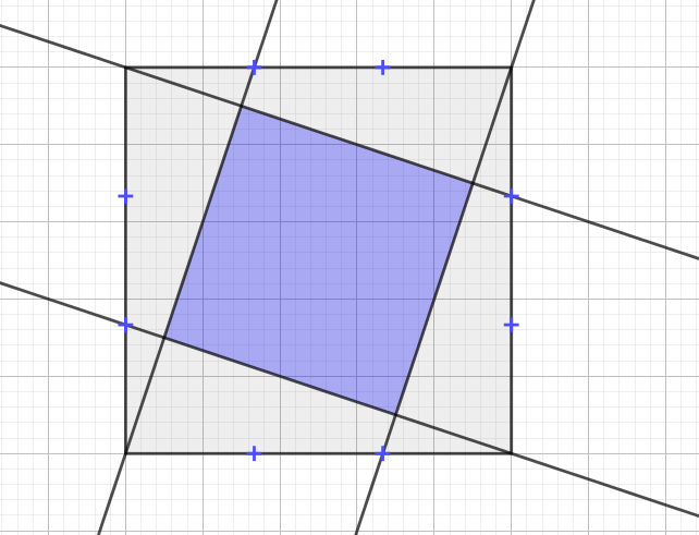 I have been presented with this diagram: the marked points are a third of the way along the sides. I need to know what fraction of the grey square is shaded blue. Any ideas?