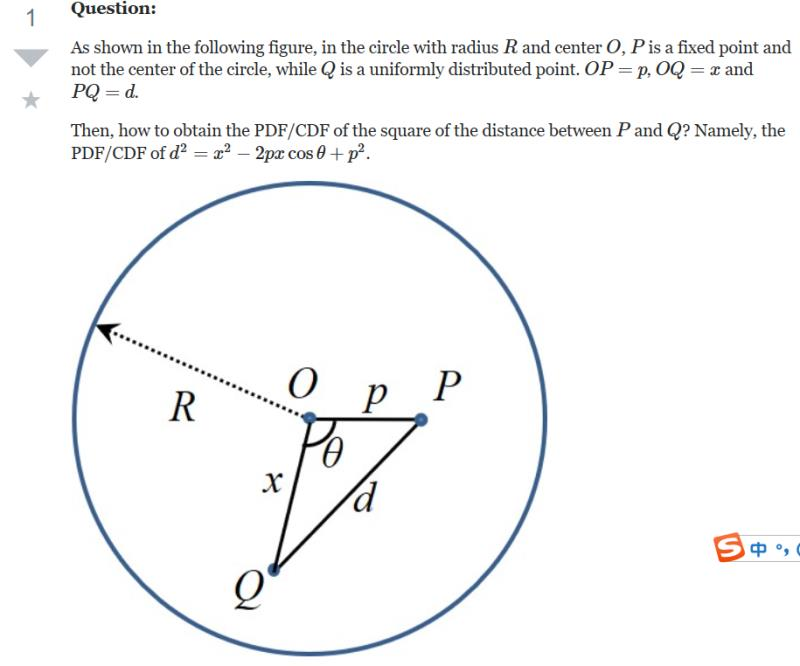 If the P circle is inside the O circle, the probability of Q lying inside the P-circle is the ratio of the circles’ areas: $P(d < d_0) = d_0^2$.