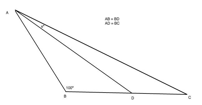 I’ve been given a trigonometry problem I can’t make head or tail of!In this triangle, AB=BD and AD=BC, while angle ABD = 100º. What’s angle DAC?