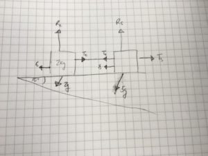 - Lower truck: $T_c - 6 - 2g\sin(10º) = 2a$