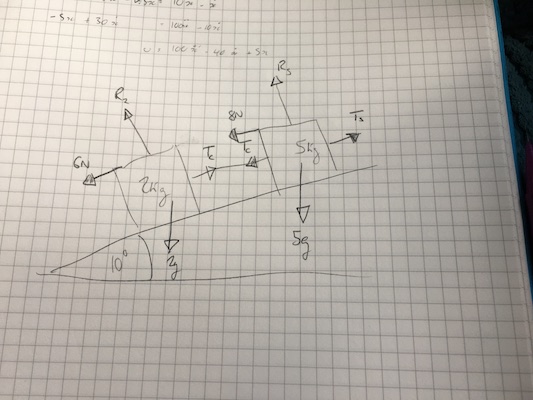 I have an exam question I don’t understand! There’s a toy truck of mass 5kg attached (by a rod) to another truck of mass 2kg on a slope at 10 degrees to the horizontal. The resistances to motion are 8N and 6N, respectively, and the whole thing is pulled up the slope by a string. The question says to show that the rod is always in tension so long as the trucks move up the slope. What’s your approach?