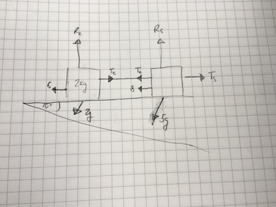 - Upper truck: $T_s - T_c - 8 - 5g\sin(10º) = 5a$