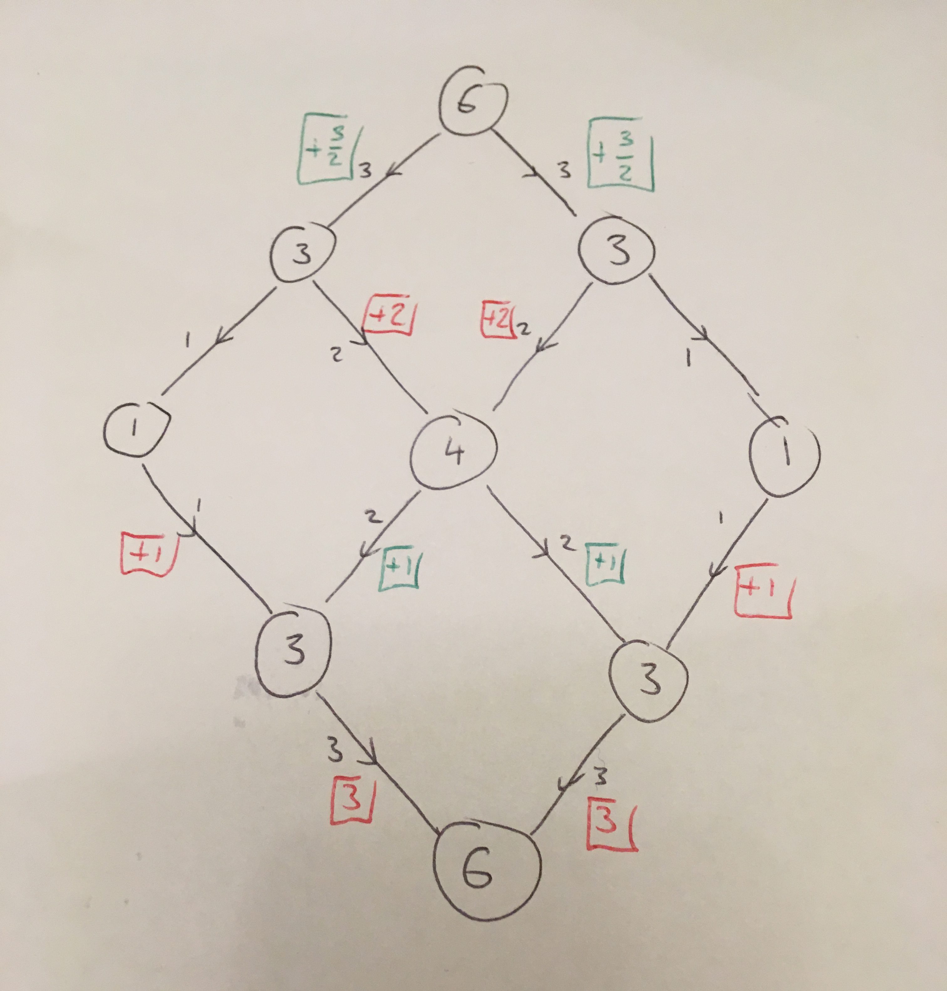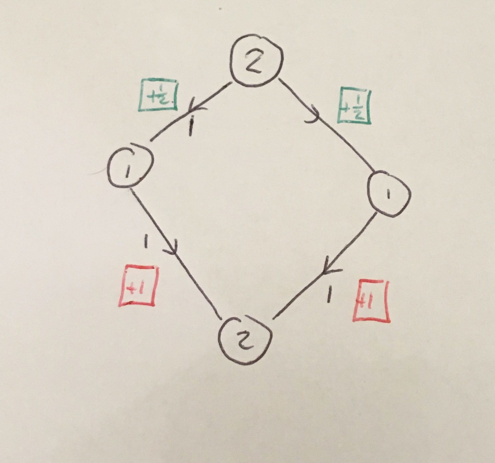 And here we start to notice something: every time you move towards the central column of nodes, you get a point. When you move away from it, you get nothing - except when you’re moving directly off of the column, in which case you get half a point.