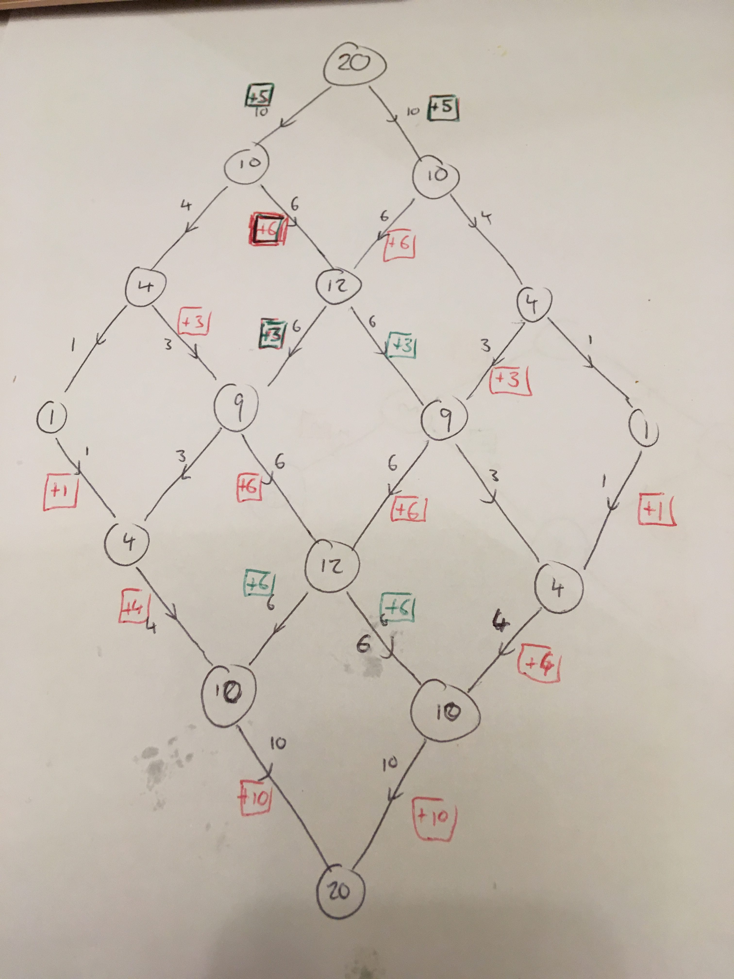 Adding all of this up gives 17 points from six paths, or an expected score of just under 3.