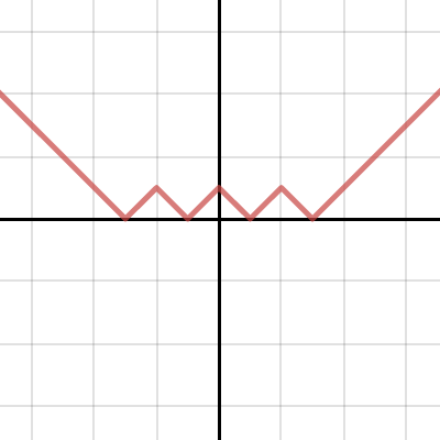 We could blindly repeat these steps a couple more times, but it’s worth having a little think here as we move the curve down a unit. All of the bottoms of the Vs now move to lie on the line $y=-1$, while all of the tops move to the $x$-axis. The curve crosses the axis at $(\pm 2, 0)$. That all means that the curve zig-zags between $(-2,0)$, $(-1,1)$, $(0,0)$, $(1,1)$ and $(2,0)$, and heads upwards at either end.