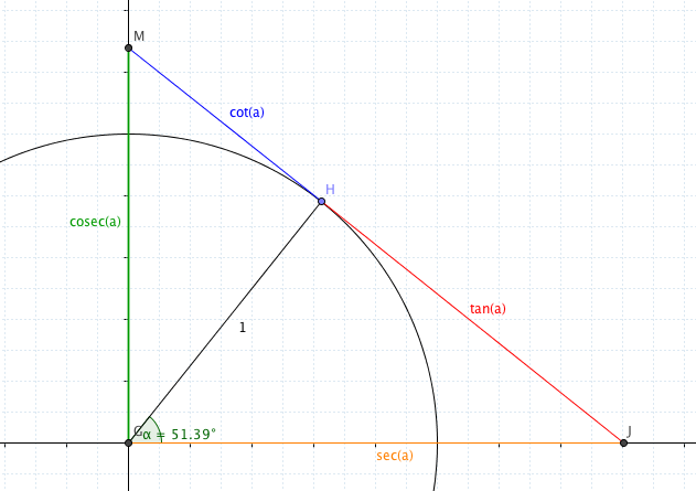 It’s very similar - only on the other side of the angle! The distance from H to the $y$-axis is the cotangent ($\cot(\alpha)$) and the distance along the $y$-axis is the cosecant ($\cosec(\alpha)$). Once more, Pythagoras confirms the last of the minor trig identities.