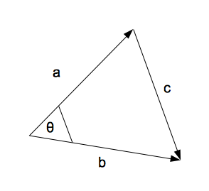 $\left|{\bb c}\right|^2 = \left|\bb {a}\right|^2 + \left|\bb b\right|^2 - 2\left|\bb a\right|\left|\bb b\right| \cos (\theta)$